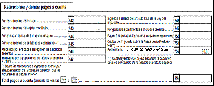 El impreso se rellena como dice hacienda, sólo que al llegar al apartado RETENCIONES Y DEMÁS PAGOS A CUENTA, se tacha el texto de alguna de las casillas que no utilicemos, e introduciremos aquí la cantidad de 80 EUROS, como cuota fija de nuestra Objeción Fiscal. Antes, ingresa esta cantidad en el proyecto alternativo que hayas elegido. Rellena la carta para hacienda, (que te facilitaremos en AHIMSA), y adjunta en tu declaración, la carta y el recibo de haber hecho el ingreso. Y por último y muy importante es, que nos envíes la ENCUESTA. |